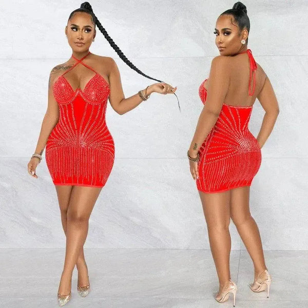 Sling Sargılı Göğüs Rhinestone Perspektif Etekli Elbise