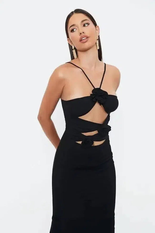 Çiçekli Hollow Dar Yaka Orta Boy Askılı Elbise
