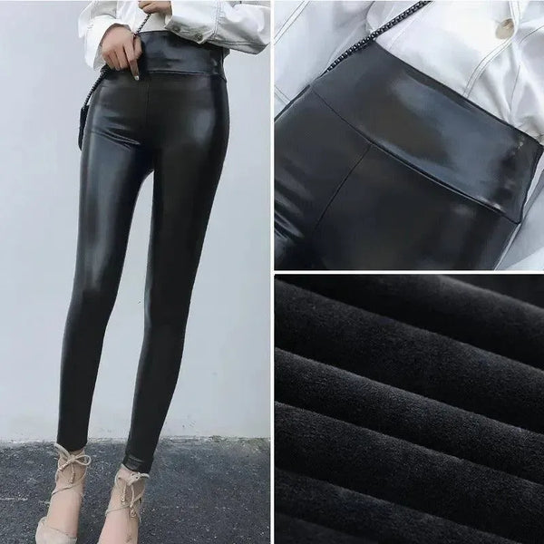 Deri Pantolon Kadın Kalın Büyük Beden Yüksek Bel PU Deri