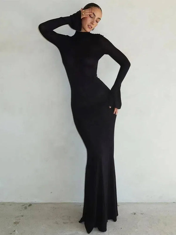 Düz Sırtı Açık Uzun Elbise - Trompet Kol Abiye