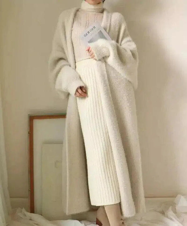 Balıkçı Yaka Elbise ile Kadın Uzun Örgü Hırka