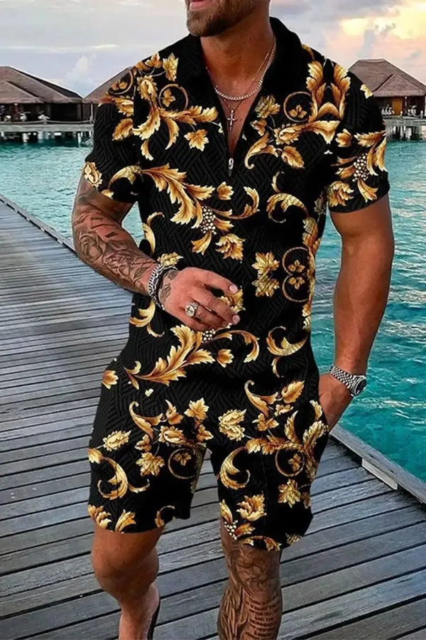 Erkek Modası Baskı Yaka Fermuarlı İki Parçalı Takım Elbise