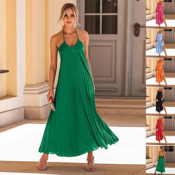 Moda A-line Pileli Askılı Uzun Elbise Yazlık Günlük