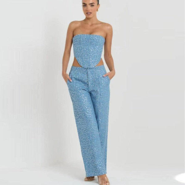 Moda Denim Payetli Tüp Üst Geniş Paça Pantolon Takım