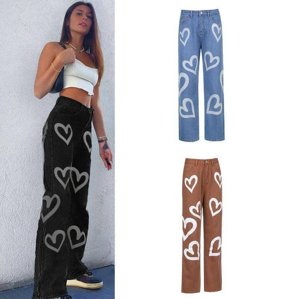 Geniş Paça Kot Kadın Aşk Baskılı Düz Bol Açık Mavi / 2XL