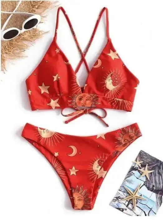 Güneş Ay Yıldız Baskılı Yüksek Bel Bölmeli Bikini