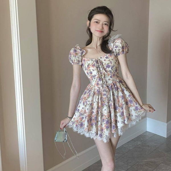 Kadın Fransız Puf Kollu Dantel Kısa Kollu Elbise