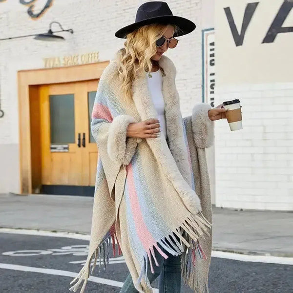 Ürün Açıklaması: Kadın Kapşonlu Pelerin Sonbahar ve Kış Çizgili