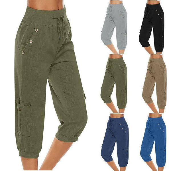Kadın Kırpılmış Pantolon Pamuk Keten Kargo Cepli Günlük Pantolon Safir Mavi / 2XL