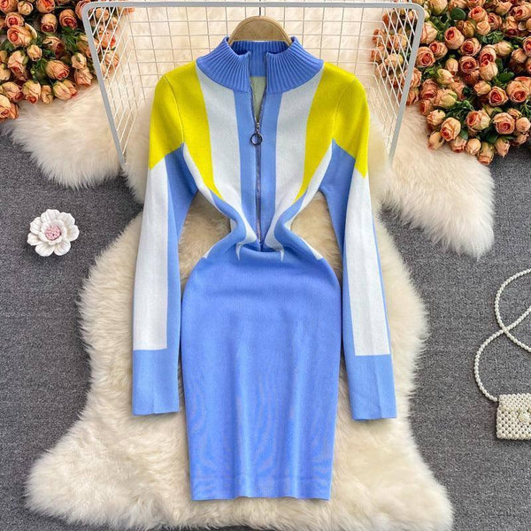 Zarif Fermuar Yaka Örme Triko Elbise