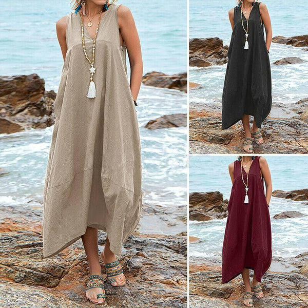Kadın Pamuklu ve Keten V Yaka Cepli Günlük Elbise