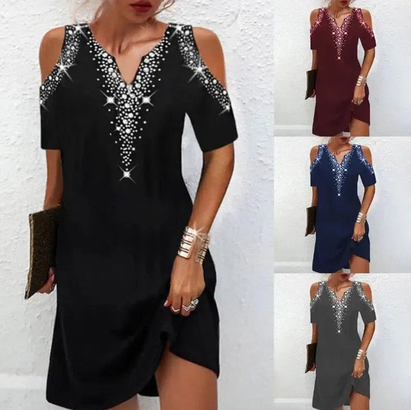 Kadın V Yaka Kapalı Omuz Baskılı Kısa Kollu Elbise