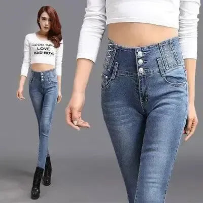 yeni yüksek bel tokalı streç kot kadın Koreli