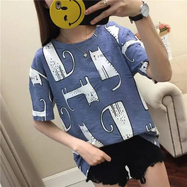 Kedi Baskılı Kısa Kollu T-Shirt Kırmızı Öğrenci Alt Üstü