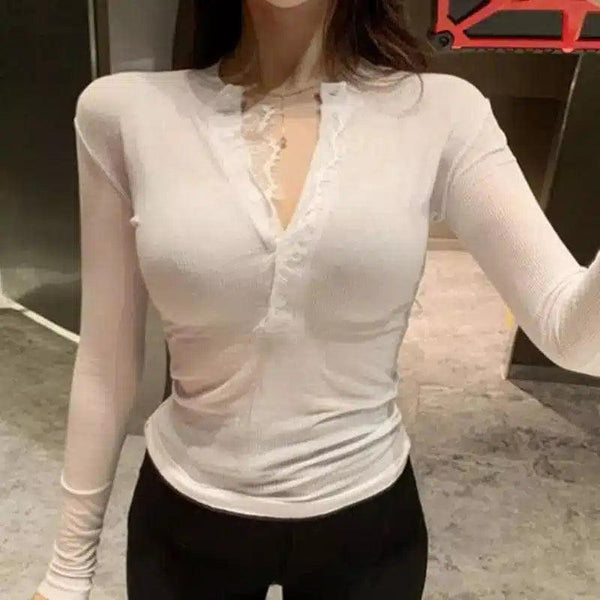 Kadın Uzun Kollu Şeffaf Dantel Trim Üst