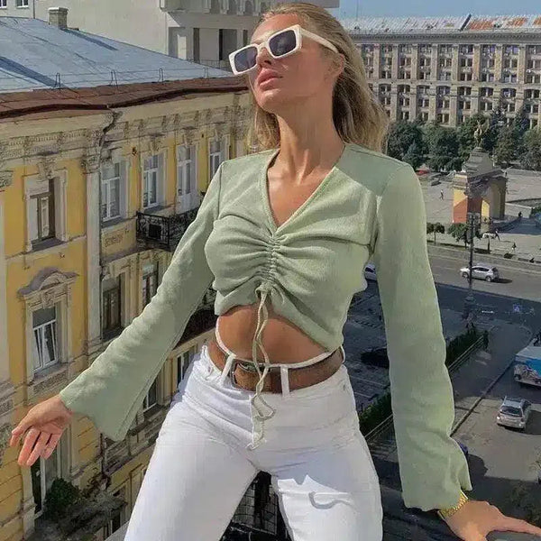 Kadın Önü Bağcıklı V Yaka Kırpık Üst
