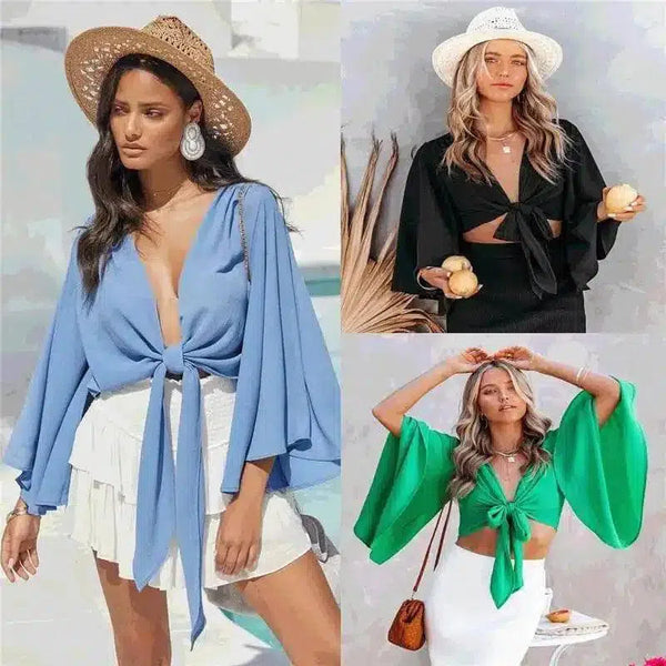 Geniş Kollu Kadın Önü Bağlamalı Kırpık Üst
