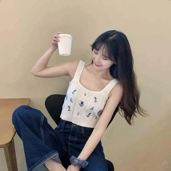 Örgü Çiçekli Kırpma Üst Kolsuz Günlük Giyim
