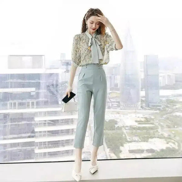 Bayan Zarif Kravat Yaka Bluz & Kırpılmış Pantolon