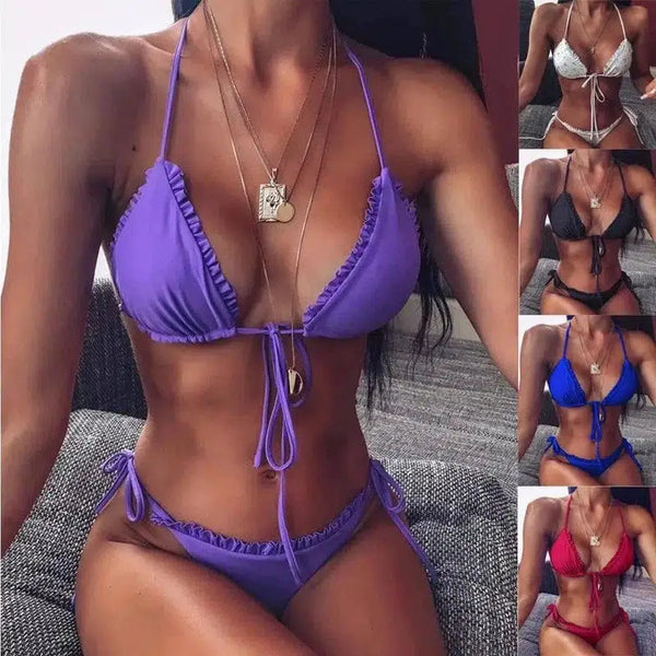 Küçük fırfırlı yırtmaçlı baskılı çift taraflı bikini