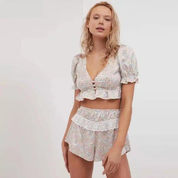 Kadın Çiçekli Fırfırlı Crop Üst & Şort Takım