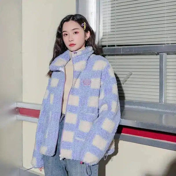 Bayan Sahte Kuzu Kadife Sıcak Yün Kareli Ceket