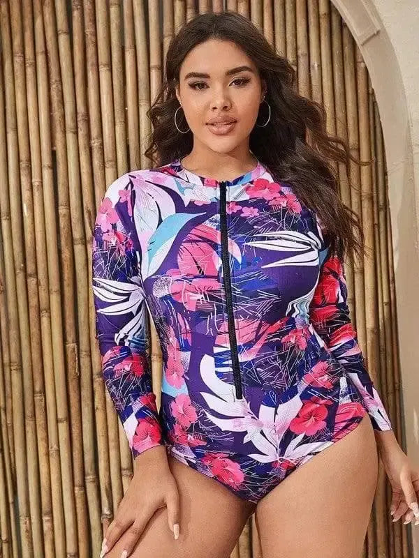 Ürün Açıklaması: Bayan Büyük Beden Tek Parça Mayo, Uzun Kollu Baskılı