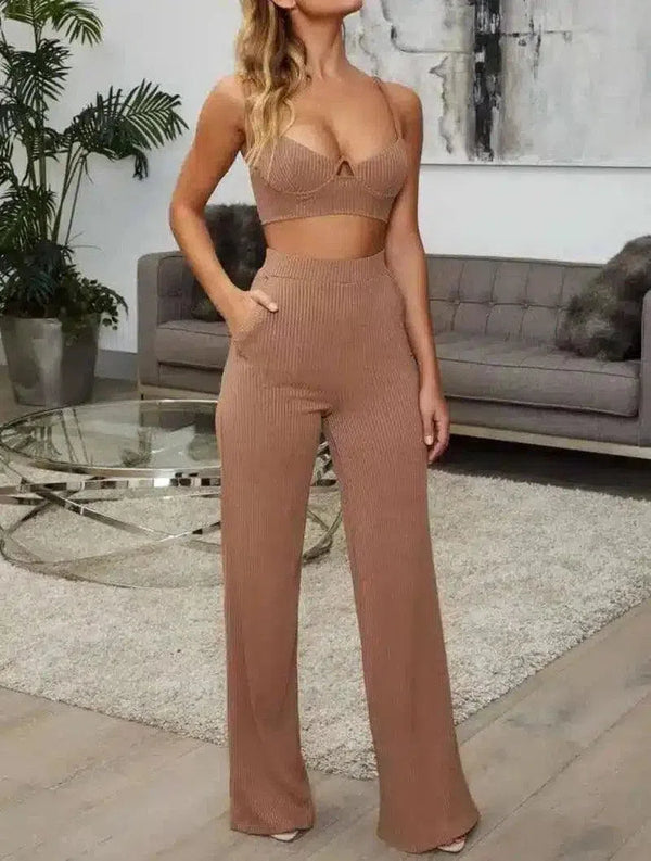 Kadın Nervürlü Örgü Halter Üst ve Pantolon Takımı
