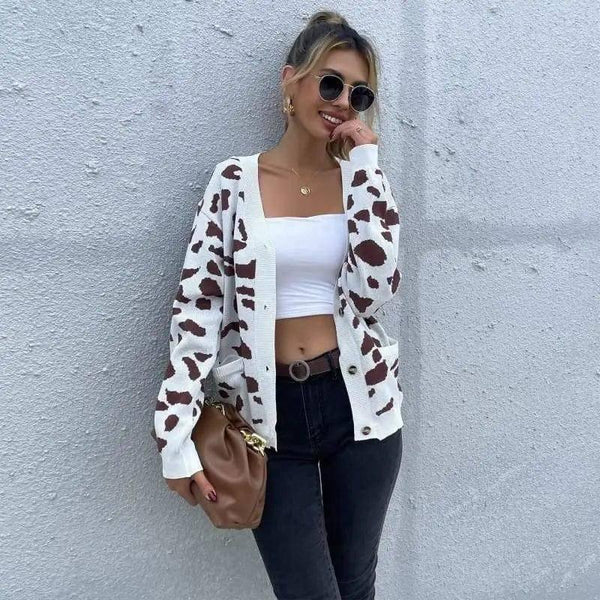 Leopar Desenli V Yaka Örme Kazak Kaban