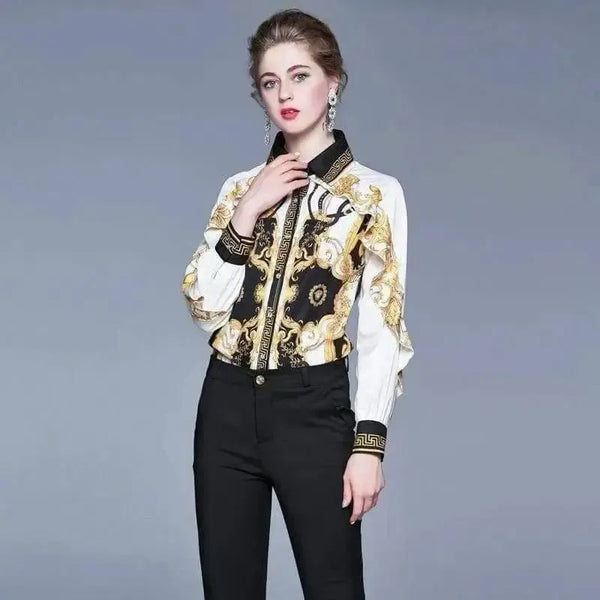 Retro Saray Baskılı Fırfırlı Slim-fit Moda Baskılı Gömlek