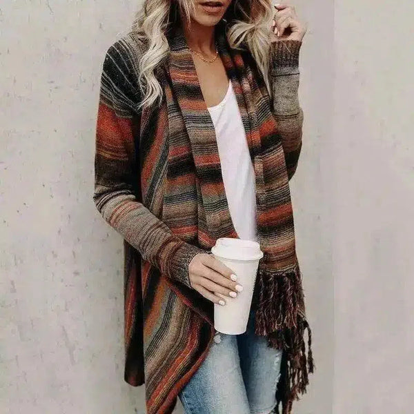 Sıcak Tutan Çizgili Püsküllü Kadın Hırkası