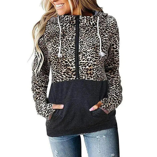 Kadın Leopar Desenli Kapüşonlu Cepli Sweatshirt