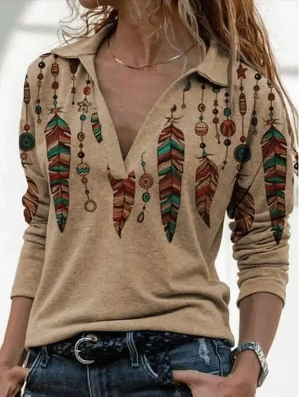 Retro uzun kollu baskılı V yaka gömlek kazak