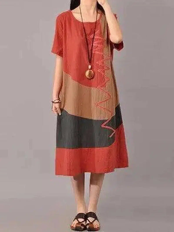 S-5XL Kadın Günlük Kısa Kollu Splice Gevşek O-boyun Orta Uzun