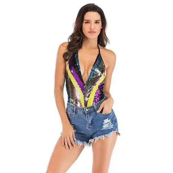 Payetli Halter Bodysuit & Yırtık Denim Şort