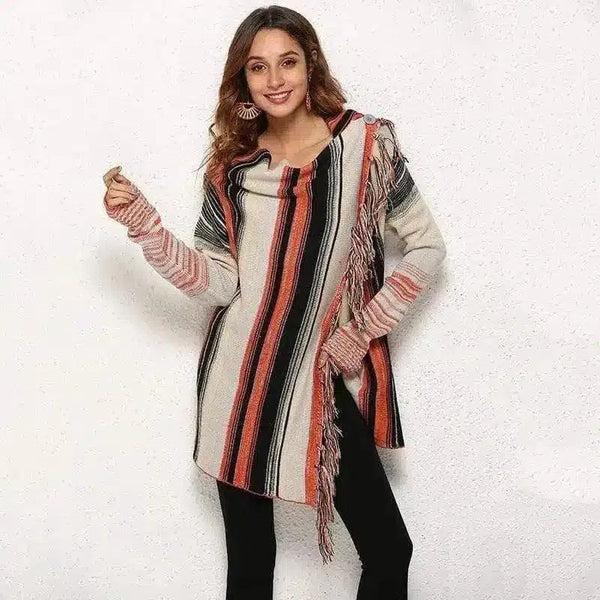 Çizgili Püsküllü Kadın Kapüşonlu Hırka