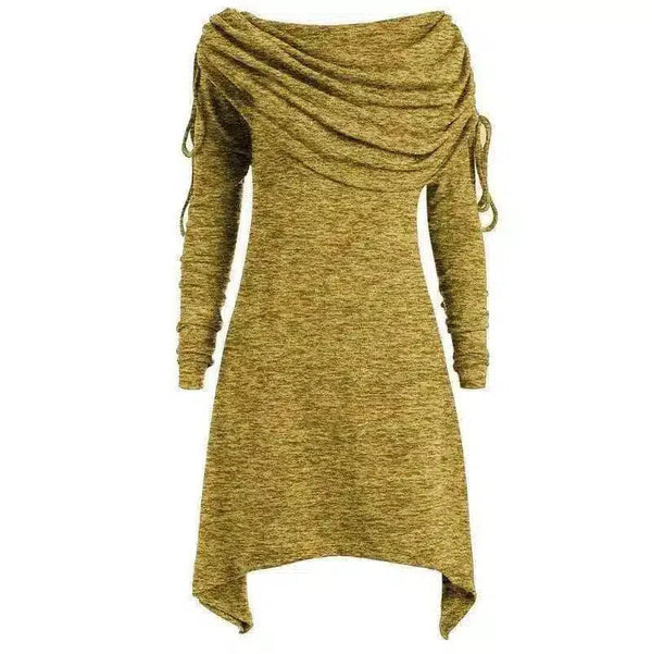 Bu şık ve benzersiz Asimetrik Drape Yaka Elbiseyi gardırobunuza dahil ederek rahatlığı bir arada yaşayın