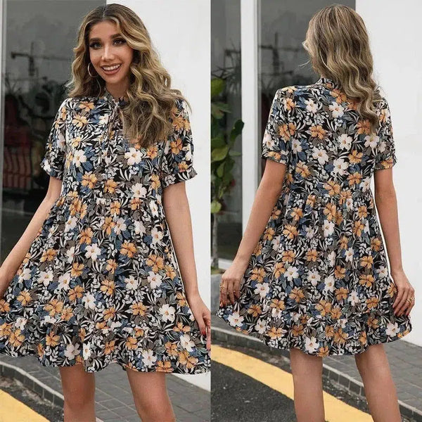 Dik Yaka Fırfırlı Küçük Çiçekli Kısa Kollu Elbise