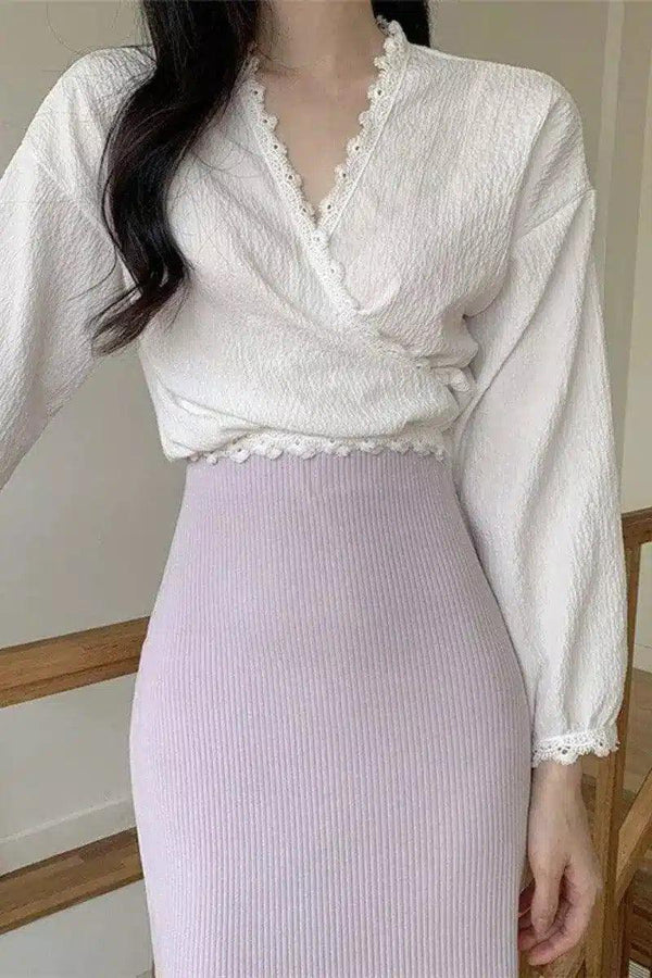 Dantel Kesimli V Yaka Bluz & Örgü Kalem Etek