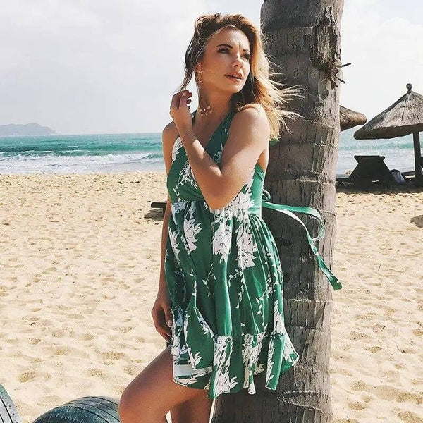 V Yaka Halter Baskı Kolsuz Plaj Elbisesi
