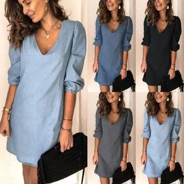 V Yaka Kısa Kollu Günlük Bol Pamuklu ve Keten Elbise