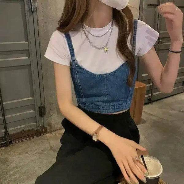 - Giysi türü: Temel beyaz tişört üzerine denim crop top içeren katmanlı topluluk