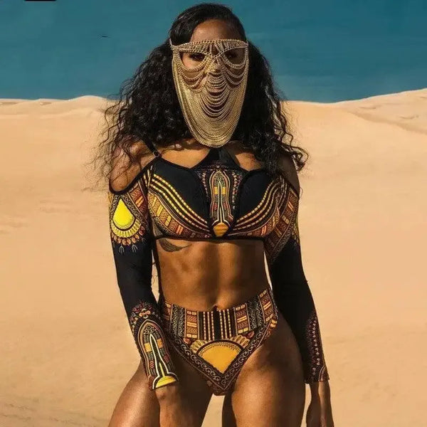 Kadın Uzun Kol Baskılı Yüksek Bel Bikini İki Parça