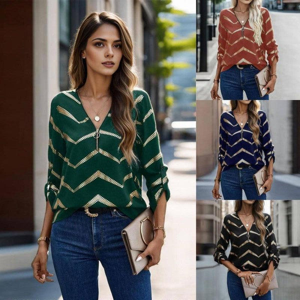 Kadın Günlük Uzun Kollu V Yaka Çizgili Gömlek