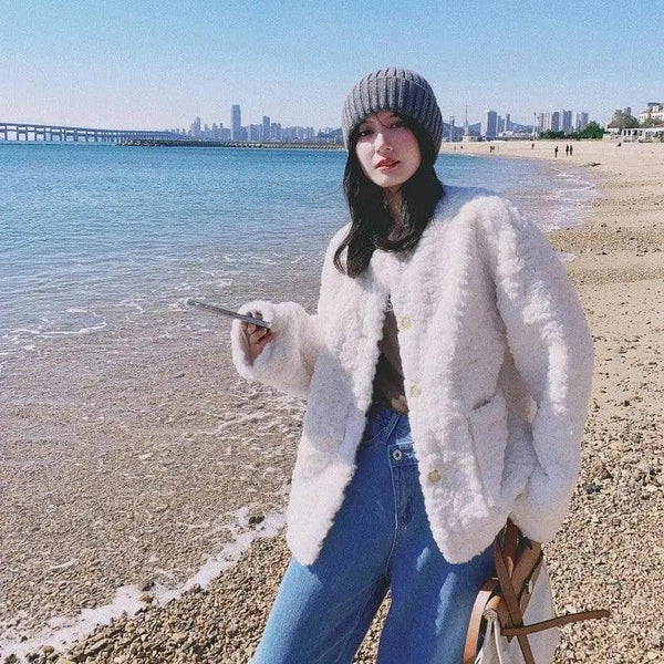 Yuvarlak Yaka Metal Tokalı Tavşan Kürk Kaban Kadın